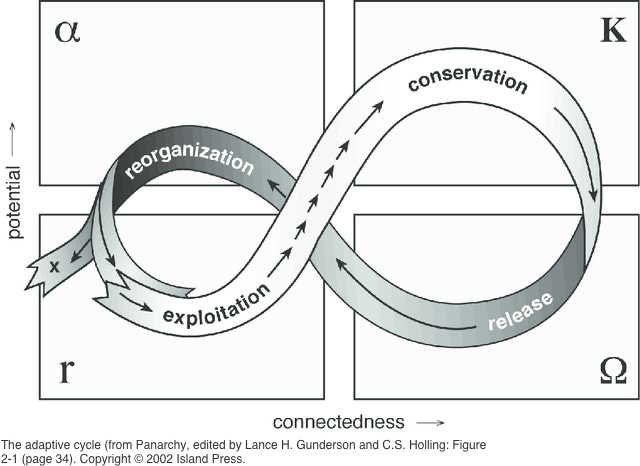 Finally, I’ll end with a poem I wrote a few years ago based on the adaptive cycle. The adaptive cycle is a systems theory framework developed by environmental scientists who sought to understood how ecological systems adapt and change over time. I love grand theories that can explain large, long processes, and this one fits the bill. What I particularly like about it is that while it was developed to understand the complex energetic dynamics of large scale ecological systems, it can also quite easily be utilized to understand one’s own internal system. Just as the a mature old growth forest emerges from a disturbed ecosystem over time, one’s own self goes through periods of disruption, emergence, maturation, and austerity.